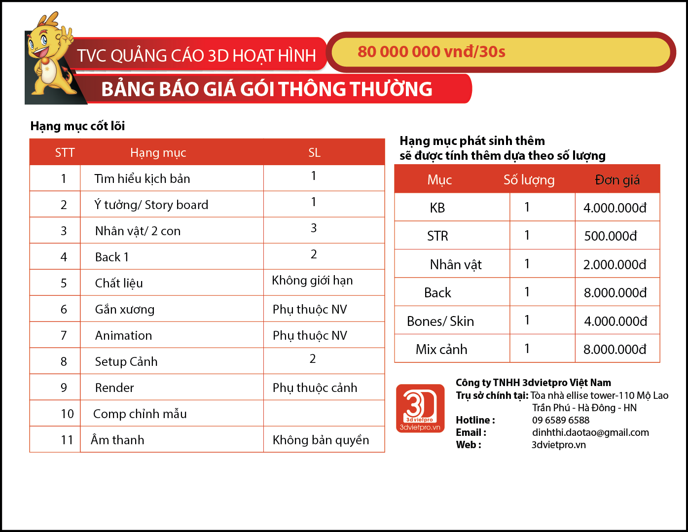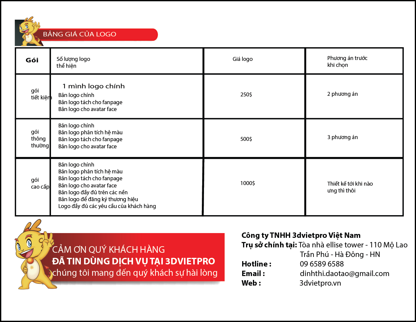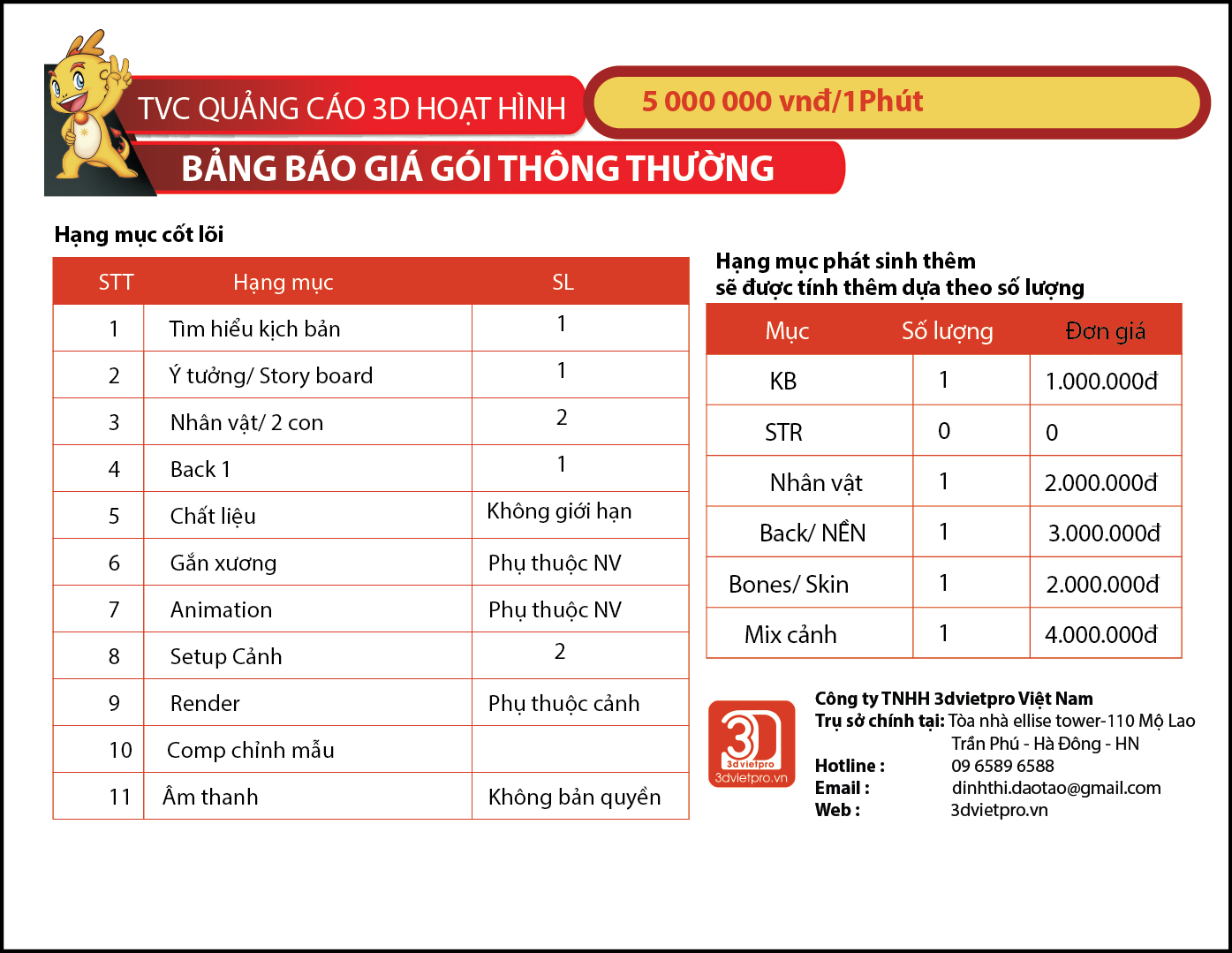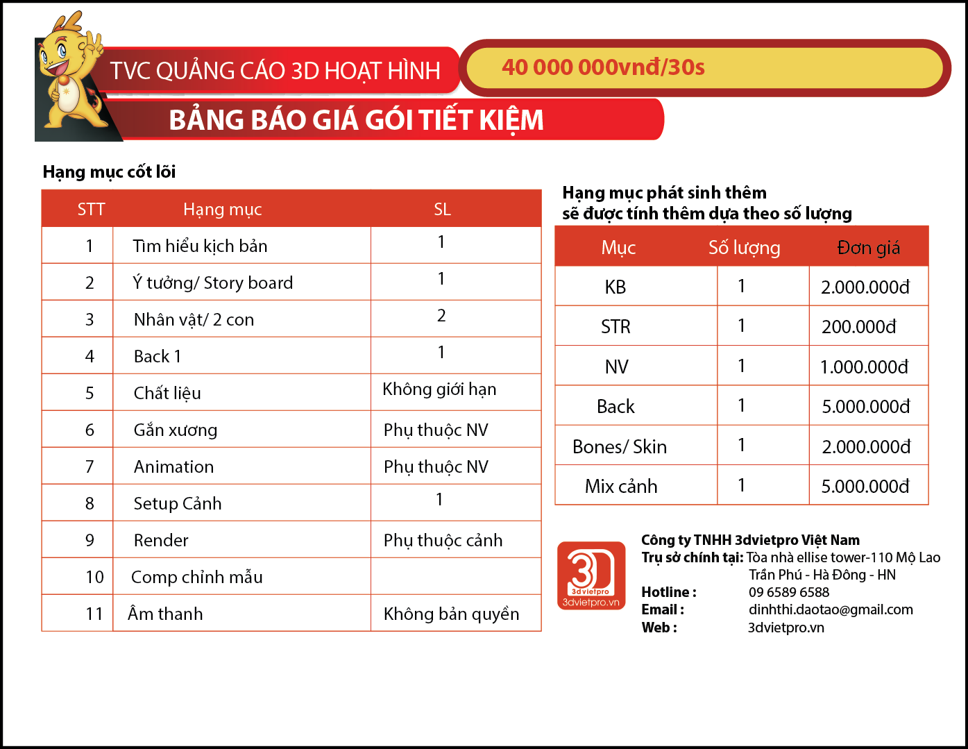 Bảng báo giá các gói TVC: Gói Tiết Kiệm, Gói thông thường, Gói đầu tư chất lượng cao Liên hệ: hotsline. 09 6589 6588
